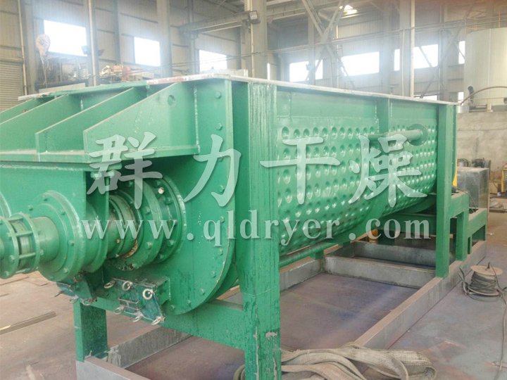 The dryer is an indirect heat transfer device which utilizes a high degree of mechanical agitation to enhance contact with the product being dried. Evaporation rates per square foot of heat transfer surface are maximized through self-cleaning paddles and the mixing effect. Movement of the process material between the slanting surfaces of the revolving wedge-shaped paddles generates shearing forces, which clean the paddle surfaces and maximize conductivity. Counter rotating shafts move the material away from the walls, cleaning the walls by means of the tab on each paddle. This results in higher heat transfer rates than disc or single shaft designs. The wedge-shaped paddles, and the intermeshing of the dual agitators, create a localized mixing effect around the paddle. This allows more individual particles in the bed to be exposed directly to the heat transfer surface, thereby increasing the heat transfer rate, allowing the use of smaller equipment.
