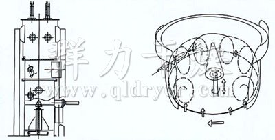 After purification, the heated air from the annulus into the container, the material showed a high-speed vessel boiling shape, due to the distribution of the rotating plate, the material by its own gravity, air floating circumferential centrifugal force, frictional force, circumferentially surrounding the operating state.